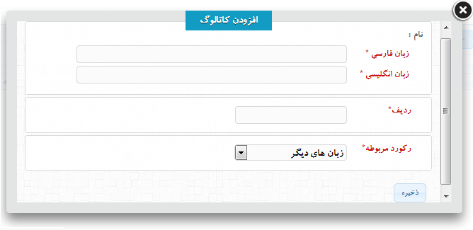 لیست برخی از comboboxهای موجود در فرم های مختلف سامانه قابل تغییر است و می توان موارد آنها را اضافه، ویرایش و یا حذف نمود. برای این کار باید به قسمت اطلاعات پایه مراجعه نمایید و از طریق اطلاعات اولیه وارد بخش اطلاعات کاتالوگ ها شوید. همانطور که در ابتدا اشاره گردید، در این بخش علاوه بر افزودن کاتالوگ به یک combobox، میتوان اطلاعات سایر موارد را نیز مشاهده و ویرایش نمود. با کلیک بر روی افزودن، فرمی مطابق شکل زیر باز می شود. در فرم زیر، وارد کردن نام کاتالوگ به زبان فارسی و انگلیسی ضروری میباشد. عددی که در فیلد ردیف وارد میشود بیانگر این است که کاتالوگ موردنظر در کدام ردیف از combobox رکورد مربوطه نمایش داده شود. همچنین تعیین این مورد که کاتالوگ موردنظر به کدام combobox مربوط است در فیلد رکورد مربوطه انجام می شود. در پایان با کلیک بر روی دکمه ثبت اطلاعات و تغییرات، اطلاعات کاتالوگ ذخیره می شود. لازم به ذکر است که در این بخش از سامانه تنها میتوان موارد combobxهایی را تغییر داد که در لیست فیلد رکورد مربوطه آورده شده اند.