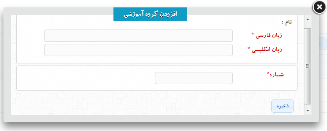 برای افزودن یک گروه پژوهشی باید ابتدا به قسمت اطلاعات پایه رفته و سپس از منوی اطلاعات اولیه، بخش گروه پژوهشی را انتخاب نمایید. در این بخش از سامانه مانند سایر بخش ها علاوه بر افزودن اطلاعات برای یک گروه پژوهشی، امکان مشاهده و ویرایش اطلاعات سایر رکوردها نیز وجود دارد. با کلیک بر روی افزودن، فرمی با نام افزودن گروه پژوهشی باز می شود که مطابق شکل زیر است. مطابق شکل، وارد کردن نام گروه پژوهشی به زبان فارسی و انگلیسی ضروری است. همچنین در فیلد شماره، شماره گروه آموزشی(مانند شماره درس) وارد می شود. با کلیک بر روی دکمه ثبت اطلاعات و تغییرات نیز اطلاعات وارد شده در سامانه ذخیره می شود.