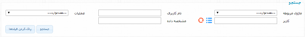 تمامی فعالیت هایی که کاربران در سامانه انجام می دهند ذخیره شده و امکان مشاهده آن ها وجود دارد. با مراجعه به بخش اطلاعات پایه و سپس انتخاب لاگ عملیات کاربر از منوی مدیریت سیستم میتوان لاگ عملیات خود و در صورت داشتن دسترسی، لاگ عملیات برخی از کاربران را مشاهده نمود. فرم جستجوی این صفحه از سامانه نیز مانند سایر بخش ها دارای فیلدهای مختلفی است که در شکل زیر نمایش داده شده است.