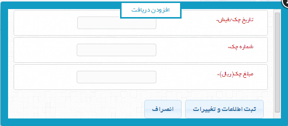 با تأیید دکمه اطلاعات دریافت از فرم مالی، صفحه جدیدی باز می شود که مشابه سایر قسمت های سامانه دارای فرم جستجو و جدول نمایش اطلاعات می باشد. در پایان و پس از ورود اطلاعات ضروری فرم یعنی تاریخ چک، شماره چک و مبلغ آن، برای ثبت اطلاعات دریافت باید دکمه ثبت اطلاعات و تغییرات تأیید شود. با تأیید این دکمه اطلاعات دریافت به صورت یک رکورد در جدول اطلاعات نمایش داده می شود. با زدن دکمه افزودن، فرمی مطابق شکل زیر باز می شود.